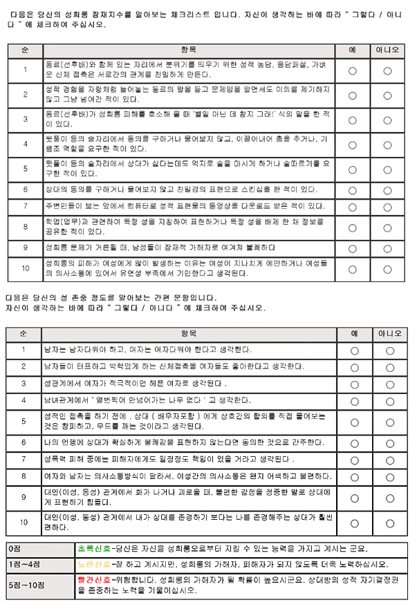 체크리스트는 성희롱과 성존중에 대한 문항, 총 20개 항목으로 구성돼 있다.