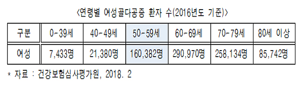 지난해 상반기 골다공증으로 진료받은 환자가 63만명을 훌쩍 넘어선 것으로 나타났다. 이중 90% 이상이 여성이었다. 특히 여성 골다공증환자는 50대에 접어들면서 급증세를 보이고 있다. 국회는 노년기 여성의 삶의 질을 높이기 위해 조기진단과 치료지원 확대 등 대책마련이 시급하다고 지적하고 나섰다.