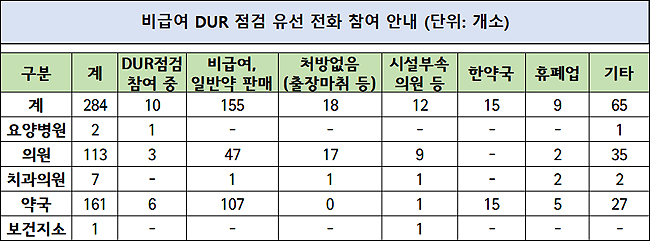 심평원은 284개소 중 274개소에 대해 DUR 점검 참여 안내를 마쳤고, 이후 요양병원 1개소, 의원 3개소, 약국 6개소가 DUR 점검에 참여하고 있다.