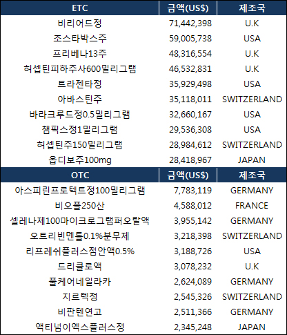 작년 수입실적 1위 ETC '비리어드'…OTC는 '아스피린'
