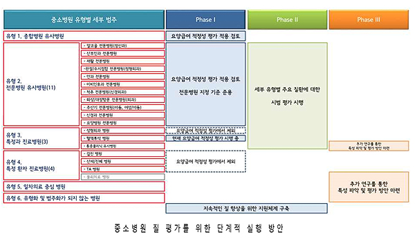 현재 심평원에서 시행 중인 요양급여 적정성 평가를 중소병원에 확대하는 것인데, 상급종합병원 및 종합병원만을 대상을 중소병원까지 확대하고 평가기간을 늘리면 충분히 중소병원에 대한 의료 질 평가가 가능하다는 얘기다.