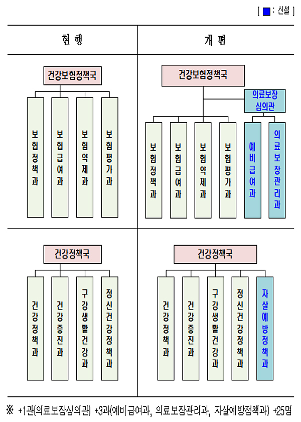 또 OECD 최고 수준의 우리나라 자살률이 개인의 문제가 아니라 사회문제라는 인식아래 자살예방 정책을 수행할 '자살예방정책과'를 설치하기로 했다.