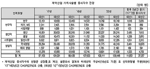 국내 제약산업 전반의 가치사슬별로는 국내 영업직이, 바이오의약품의 경우는 생산직 인력 수요가 각각 많을 것으로 예측됐다.