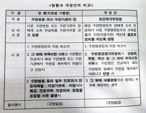 이 밖에 의료질향상분담금을 폭행누적 건수에 따라 가중치 적용해 감축하는 방안과 수련환경평가 총점에서 일정 점수 감점, 지정취소 처분 대상을 수련병원이 아닌 전문과목 단위로 변경, 일정기간 이내 유사사건 반복 발생 시 지정취소를 강제하는 '삼진아웃제' 등을 제안했다.