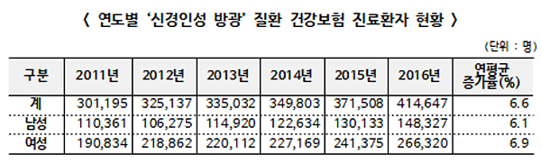 진료 인원은 2011년 30만1000명에서 2016년 41만5000명으로 연평균 6.6% 증가했으며, 남성은 2011년 11만명에서 2016년 14만8000명으로 연평균 6.1%, 여성은 2011년 19만명에서 2016년 26만6000명으로 연평균 6.9% 증가했다.