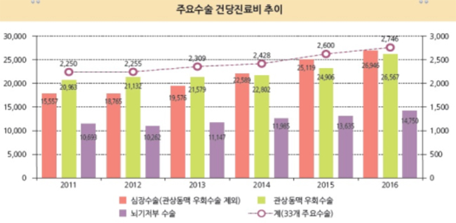 주요수술 건당 진료비는 2011년 223만원에서 2016년 275만원으로 연평균 4.1% 증가했다. 건당 진료비가 높은 수술은 심장수술(2695만원), 관상동맥우회수술(2657만원), 뇌기저부수술(1475만원) 등이 꼽혔고, 건당 진료비가 낮은 수술은 치핵수술(91만원), 백내장수술(95만원), 편도절제술(105만원) 등으로 나타났다.