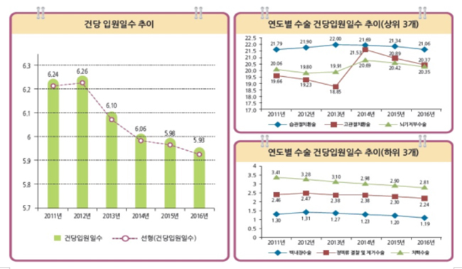 인구 10만명당 수술건수는 2011년 3254건에서 2016년 3431건으로 5년 동안 연평균 1.1% 증가했으며, 백내장수술 992건, 제왕절개수술 652건, 치핵수술 381건 등으로 많았다.