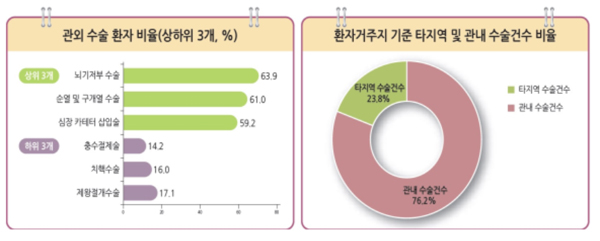 거주지역 내에서 수술 받은 비율이 높은 수술은 충수절제술(85.8%), 치핵 수술(84.0%), 제왕절개수술(82.9%) 순이었다.