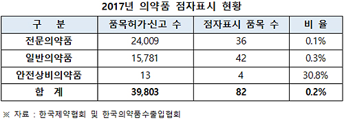 실제로 전문약과 일반약의 점자표시 품목비율은 각각 0.1%, 0.3%에 불과한 실정이다. 그나마 점자표시가 활성화 된 안전상비의약품도 30.8% 수준에 머물러 총 0.2% 수준만 점자표시가 돼 있다.