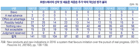 해외 가치평가 동향을 살펴보면 외국도 매년 꾸준히 신약이 도입되고 있지만 혁신성은 미흡한 것으로 평가되고 있다. 실제로 2007~2016년 프랑스에서 신약과 새로운 적응증 추가 약의 혁신성을 평가한 결과 총 992개 의약품 중 65개(6.6%)만이 기존 약보다 개선된 것으로 평가됐다.
