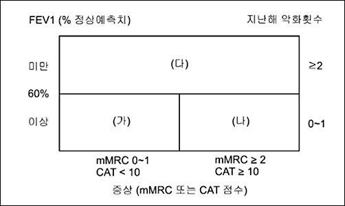 주요 진단기준이었던 FEV1을 삭제한 채 호흡곤란점수(mMRC)와 연간 악화횟수에 따라 COPD 환자를 네 그룹(A·B·C·D군)으로 분류하게 한 것이다. 중증도가 높은 C군(mMRC≤1점, 전년도 악화횟수≥2회)과 D군(mMRC≥2점, 전년도 악화횟수≥2회)에선 ICS/LABA 병용요법을 아예 제외시키거나 후순위로 미뤘다.