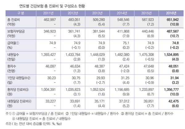 의료이용 측면에서 보면 환자수가 0.8%, 내원일수는 4.0% 증가했다. 환자수는 2015년 4765만명에서 2016년 4805만명으로 큰 차이가 없었다. 반면 내원일수는 14억7531만일에서 15억3490만일로 최근 5년 중 가장 많이 늘었다.