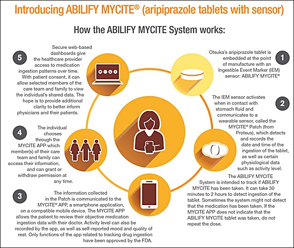 13일(현지시각) 로이터 등 다수 외신들에 따르면, 미국식품의약국( FDA)이 소화 가능한 센서가 부착된 ' 아빌리파이 마이사이트(Abilify MyCite)' 정제를 시판허가했다.
