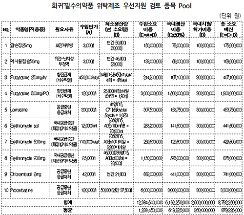 이 중 공급중단을 막기 위해 공공적 위탁 제조해야 할 10개 품목에 각 평균 8억씩 총 80억여원의 예산을 검토 중이다.