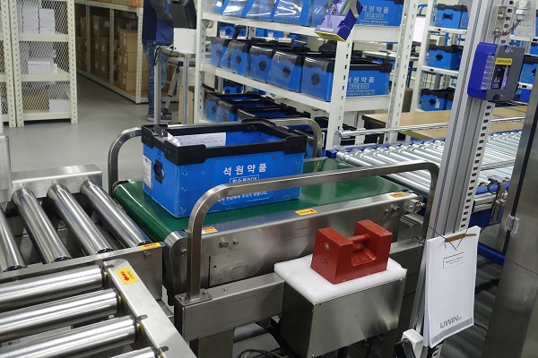 의약품 중량 자동 검수 시스템은 약국에서 주문한 약품 무게와 출고 약품의 피킹박스(의약품을 박스에 넣는 것) 중량이 일치할 경우 통과 시키고, 다를 경우 토출하는 기능을 가지고 있다. 피킹박스 안을 CCTV로 찍어 오배송 등 문제도 사전에 크로스 체킹하도록 되어 있다.