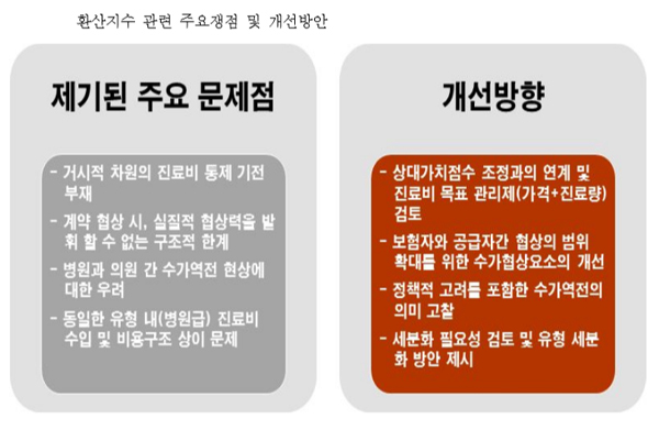 구체적으로 공급자단체 간담회 및 전문가 의견 수용, 환산지수 계약 협상 시 실질적으로 협상력을 발휘할 수 없는 구조적 문제와 함께 환산지수 산출모형에 고려되지 않은 유형별 특성에 대한 반영 필요성이 언급됐다.