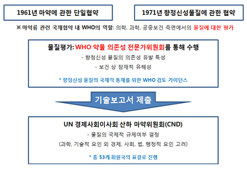 세계보건기구(WHO)가 UN 마약류 지정 시 과학적 근거자료를 제공하는 '약물 의존성 전문가 위원회(ECDD)' 자문위원으로 우리나라 식품의약품안전처 안전평가원 약리연구과 차혜진 박사를 위촉했다. ECDD(Expert Committee on Drug Dependence)는 WHO에 소속된 자문위원회로서 전 세계 20여명의 전문가로 구성되며, UN 마약위원회(Commission on narcotic Drugs, CND)를 통한 마약류 지정과 변경 등의 절차에 반드시 필요한 기술보고서를 작성·제출하는 역할을 담당하고 있다.