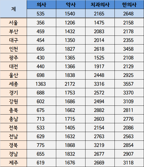 반면, 개원·개국수가 적은 세종시는 담당 인구 수 전국 최다를 기록했다. 이 지역 의사 1인당 1363명, 약사 2172명, 치과의사 3316명, 한의사 3557명으로 나타났다.
