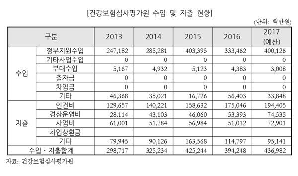 하지만 국회는 심평원이 지출예산 과다추계를 지양할 필요가 있다고 지적했다. 2012년부터 일반회계 지출 예산 집행 현황을 보면 집행률이 79.7%에서 89.3%에 그치고 있다. 과거 5년간 예산불용액이 421억4600만원 증가한 것이다.