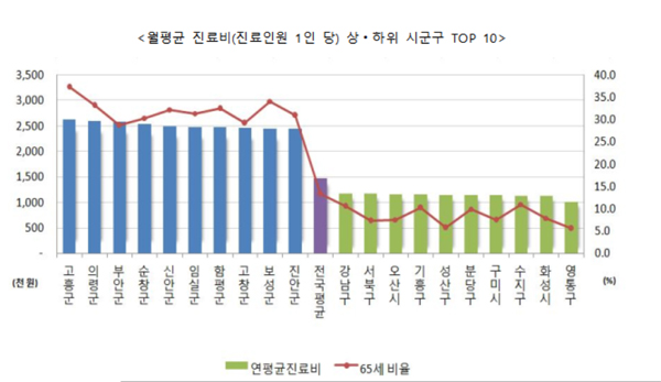 의료보장 진료인원 1인당 연평균 진료비는 116만원 수준이었다. 전남 고흥군이 263만원으로 가장 많았고, 경남 의령군 260만원, 전북 부안군 258만원 순으로 뒤를 이었다. 연평균 진료비 상위지역을 살펴보면 65세 이상 인구비율이 모두 30%에 근접하는 등 노인 비율이 높았다.