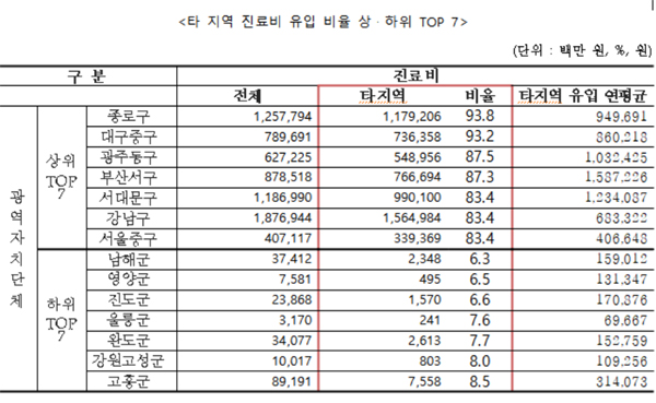 서울시 종로구가 타지역으로부터 총 1조1792억원의 진료비가 유입되면서 전체진료비 1조2578억 원 대비 93.8%로 가장 큰 진료비 유입비율을 보였다.