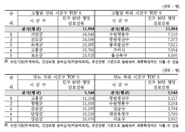 대표적인 만성질환인 고혈압의 전국 평균 인구 10만 명 당 진료인원이 1만1884명으로, 고혈압 진료인원이 많은 대표적인 지역으로는 충남 서천군(2만4849명), 전남 진도군(2만4096명), 경북 의성군(만3965명) 순이었다. 서천군은 전국 평균인 1만1884명에 비해 약 2.1배 많은 것으로 나타났다.