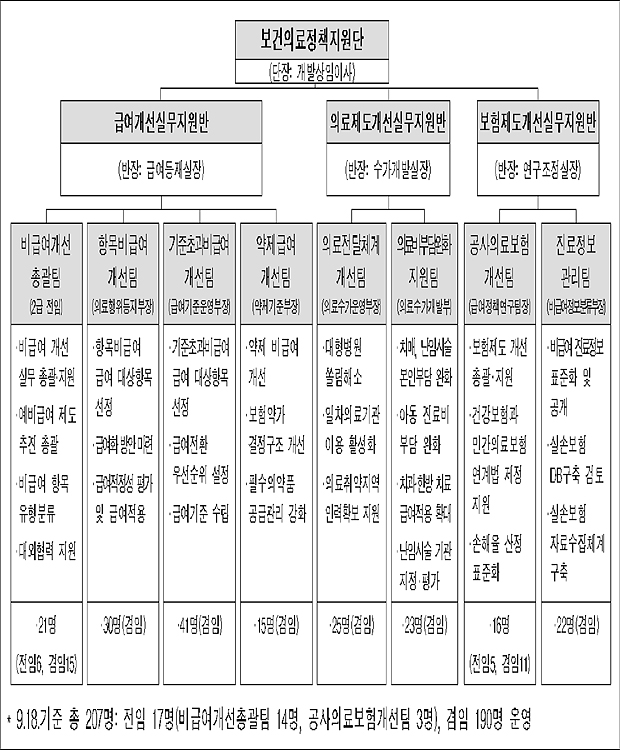 ◆의료제도개선실무지원반=의료전단체계개선팀(의료수가운영부장, 25명), 의료비부담완화지원팀(의료수가개발부장, 23명) 2개 부로 구성돼 있다. 수가개발실장이 반장이다.