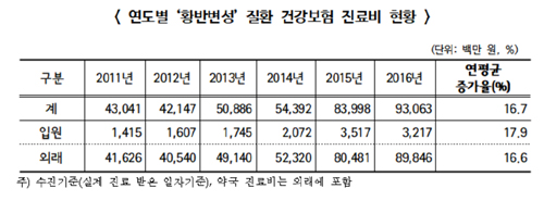 밝표자료를 보면, 황반변성 진료를 받은 환자는 2011년 9만1000여명에서 2016년 14만6000여명으로 61.2% 증가한 것으로 나타났다. 연평균 증가율은 10% 수준이었다.