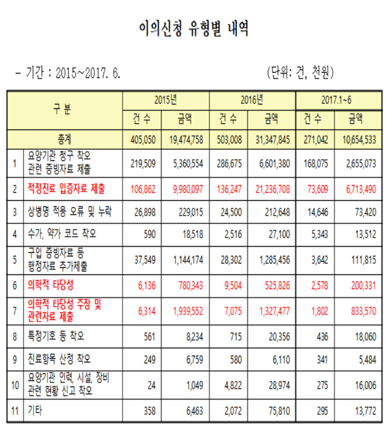 19일 국회 보건복지위원회 소속 자유한국당 김명연 의원이 건강보험심사평가원으로부터 제출받은 국정감사자료에 따르면 최근 5년간(2013∼2017. 6) 의료기관의 진료비 이의신청 건수는 총 317만9722건이었다. 지난 2013년 54만3482건에서 2016년 93만3461건으로 크게 늘어 건수로는 3년 사이 72%나 급증했다.