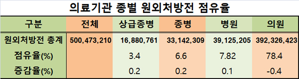 원외처방전 점유율이 가장 높은 의원은 지난해 3억9232만건의 원외처방전을 발행했지만, 점유율은 2014년 79.3%에서 78.8%, 78.4%로 소폭 감소추세다.