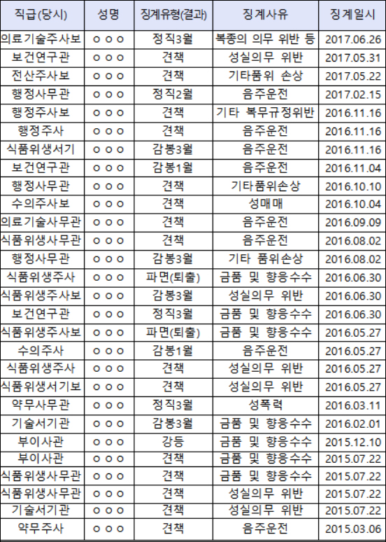 식약처 징계 사유보니 음주운전-금품·향응 수수 순