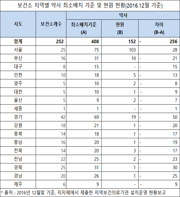 이 같은 사실은 보건복지부가 자유한국당 김승희 의원에게 제출한 '보건소 지역별 약사 최소배치 기준 및 현원현황(2016.12)'을 통해 확인됐다.