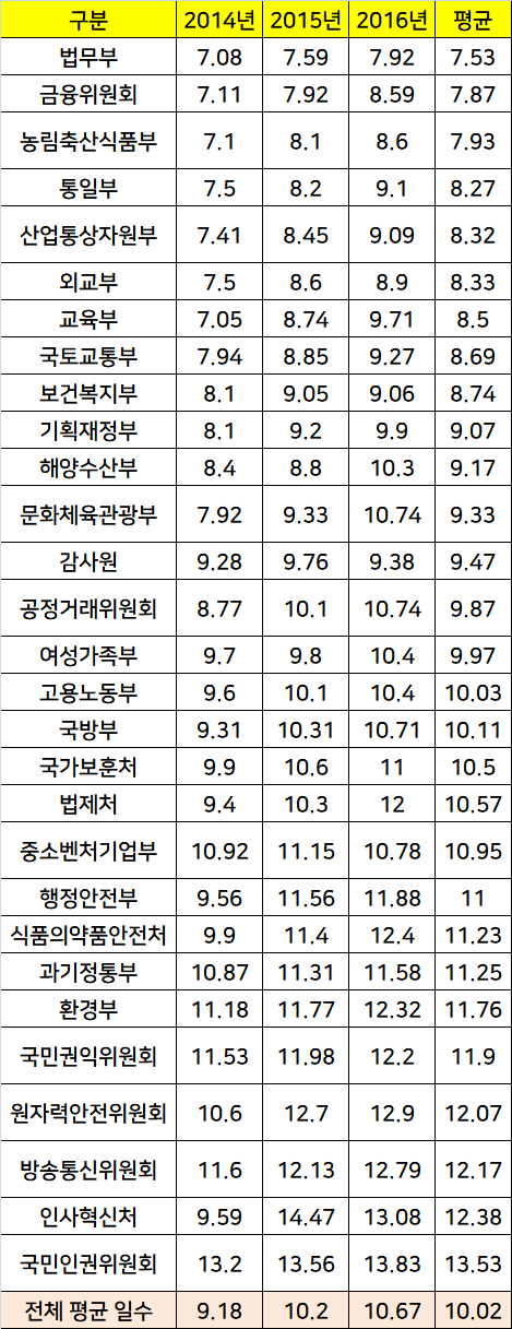 최근 3년간 29개 정부부처의 연 평균 휴가일수(병가·공가·특별휴가 제외)는 10.02일이었다.