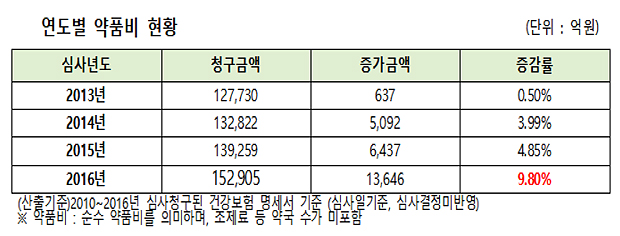 권 의원은 "박근혜 정부는 임기동안 의약품 지출관리를 거의 하지 않아서 지출이 급증 추세"라면서 "특히 건강보험급여 운영 기본원리인 비용효과성을 무시하고, 4대 중증질환 보장성 강화라는 명목으로 불합리한 고가약 급여화를 추진해 높은 약품비 증가율을 야기했다"고 지적했다.