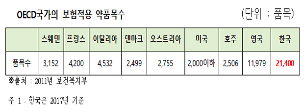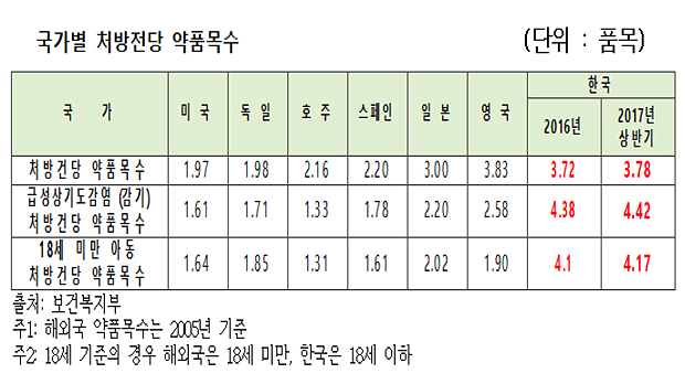 실제 처방전당 약품목수가 적은 미국(2005년)의 경우 처방건당 1.97개, 급성상기도감염(감기) 처방건당 약품목수 1.61개, 18세 미만 아동 처방건당 약품목수 1.64개 수준이었다. 한국은 2017년 상반기 기준 급성상기도감염(감기) 4.42개, 18세 미만 4.17개로 두 배 이상 더 많았다.