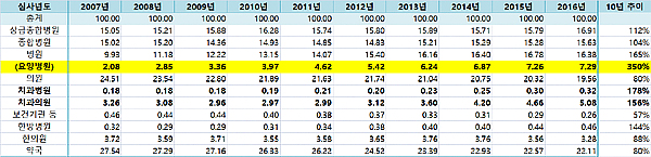 건강보험 종별 총진료비 점유율 또한 2007년 2.08%에서 2016년에는 5.21%가 증가한 7.29%로 점유율이 3.5배 늘어났다.