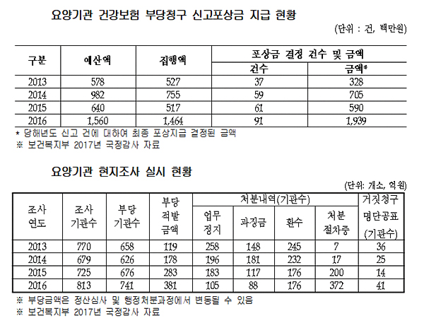 한편 복지부는 현지조사 실시 현황 자료와 함께 요양기관 부당청구 신고 포상금 지급 현황 자료 또한 함께 제출했다.