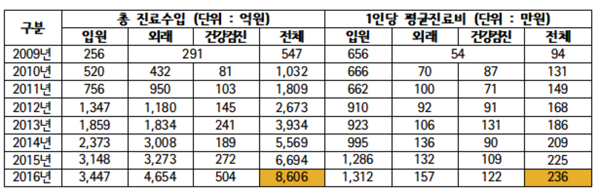 하지만 2016년 상반기 보고실적과 2017 상반기 조사실적을 살펴보면, 외국인환자가 2016년 6만2247명에서 2017년 5만6953명으로 8.5% 감소했다. 같은기간 진료수입은 1671억에서 1128억원으로 32.5% 줄었다.