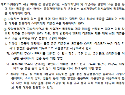 향후 중앙행정기관과 사업자는 리콜대상 물품 정보와 리콜 이유, 소비자 유의사항과 리콜방법을 포함한 리콜정보를 소비자가 이해하기 쉬운 용어를 사용, 제공해야 한다.