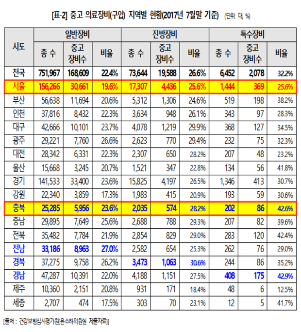 중고 의료장비 지역별 현황에서도 지방쏠림 현상은 두드러졌다. 일반장비 중고 비율은 전남이 27.0%로 가장 높았다. 최저 비율인 강원 지역(17.3%)보다 10%p 가량 차이가 났다.