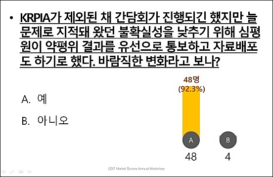 응답자들을 대표해 마이크를 잡은 B제약사 직원은 "약평위 당일에 담당자가 연락이 안돼서 힘들 때가 많았다. 약평위 결과 공개를 적극 환영한다"는 '사이다' 발언으로 공감대를 샀다.