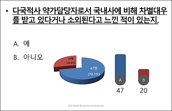 "다국적사 약가담당자로서 국내사에 비해 차별대우를 받고 있다거나 소외된다고 느낀적이 있는지" 물었을 때 전체 응답자 67명 중 47명(70.1%)이 "그렇다"고 답했다.