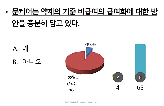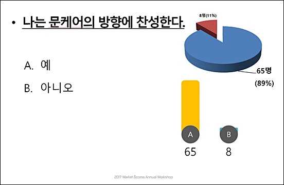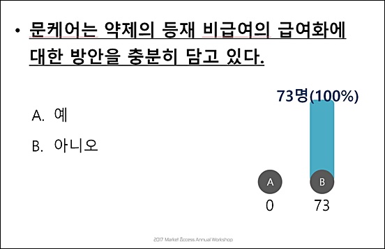 한편 이날 워크숍에서 투표 결과를 참관했던 데일리팜 최은택 기자는 "문재인 케어는 상당히 일관성 있게 잘 설계된 제도"라며, "전체 보장률에 더해 약제보장률을 함께 고려해야 한다"는 견해를 밝혔다. 전체 보장률 관점에서 바라볼 때 문재인 케어의 약제 보장률은 약 75%로 높은 편에 속한다.