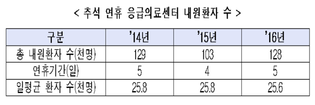 보건복지부는 '2016년 추석연휴 응급의료센터 내원환자 분석' 결과를 24일 발표했다. 명절 연휴 때 문을 여는 권역 또는 지역 응급의료센터는 151개였다.