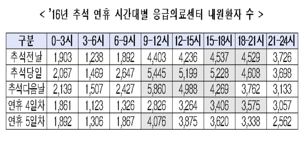 환자는 명절당일과 그 다음날이 가장 많았다. 평상시와 비교하면 평일의 2.3배, 주말의 1.6배나 됐다. 복지부는 병의원 휴진과 연휴기간 피로도 증가 등을 원인으로 분석했다.