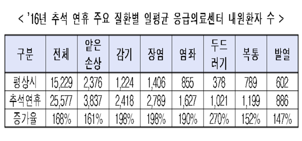 지난해 추석 연휴기간 동안 응급의료센터를 이용한 환자가 12만명을 훌쩍 넘어선 것으로 나타났다. 이는 평상시 평일과 비교하면 2배 이상 높은 수치다. 증상은 두드러기, 감기, 염좌 등의 순으로 많았다.