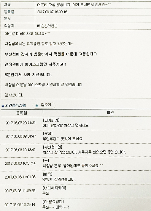 A약사는 "처장이 부하직원들에게 '더운 데 고생한다'고 법인카드로 아이스크림 사준 게 잘못인가"라며 "부담될까봐 5분만에 바람처럼 사라진 것 아닌가. 오히려 칭찬할 일 아닌가"라고 반문했다.
