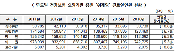 요양기관 종별 방문환자는 지난해 기준 의원 74만3000명, 종합병원 12만3000명, 병원 11만3000명 순이었다.