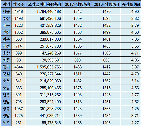 전국 약국의 기관당 월평균 조제매출은 1471만원 수준이었다. 이 중 매출이 타 지역보다 현저히 낮은 세종시를 뺀 16개 시도 평균은 1507만원으로 집계됐다.