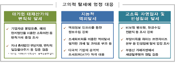 국세청은 대기업·대재산가의 편법 상속·증여, 지능적 역외탈세, 고소득 자영업자 및 민생침해 탈세 등 고의적 탈세에 조사역량을 집중하기로 했다.